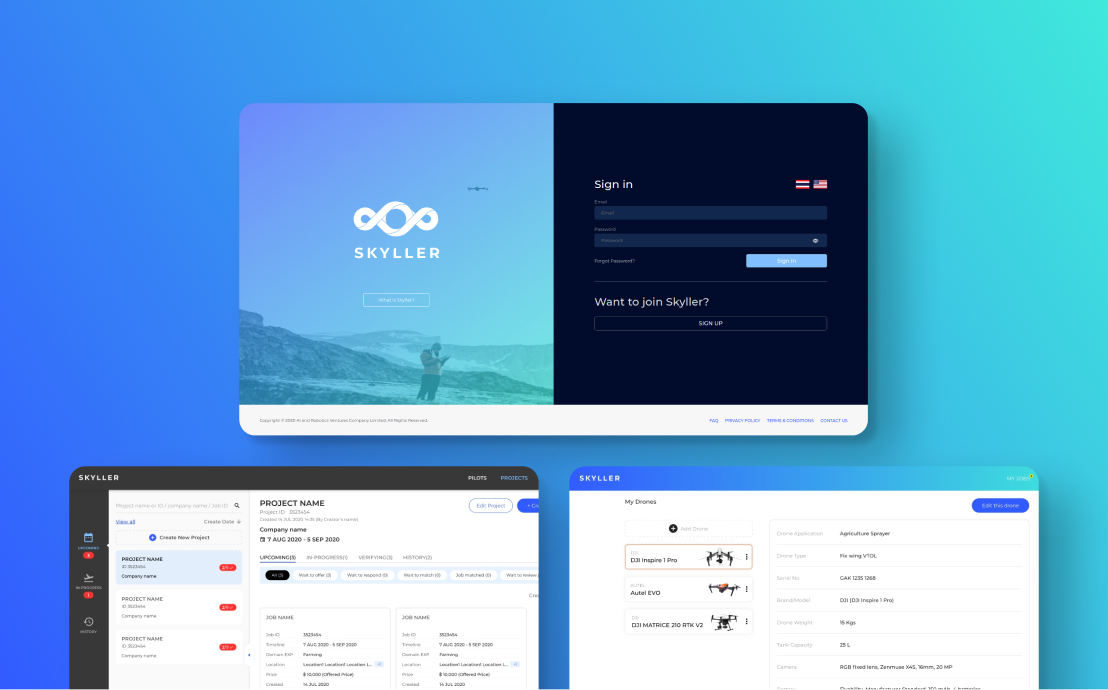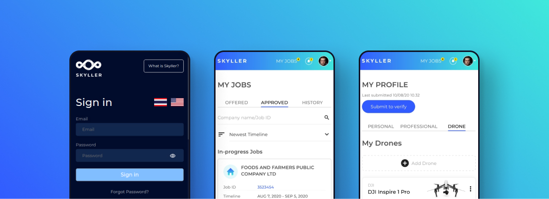 PTTEP Skyller is enterprise-grade drone services and fleet management platform. The platform matches qualified professional pilots and inspectors with industrial application for example signal tower inspection.